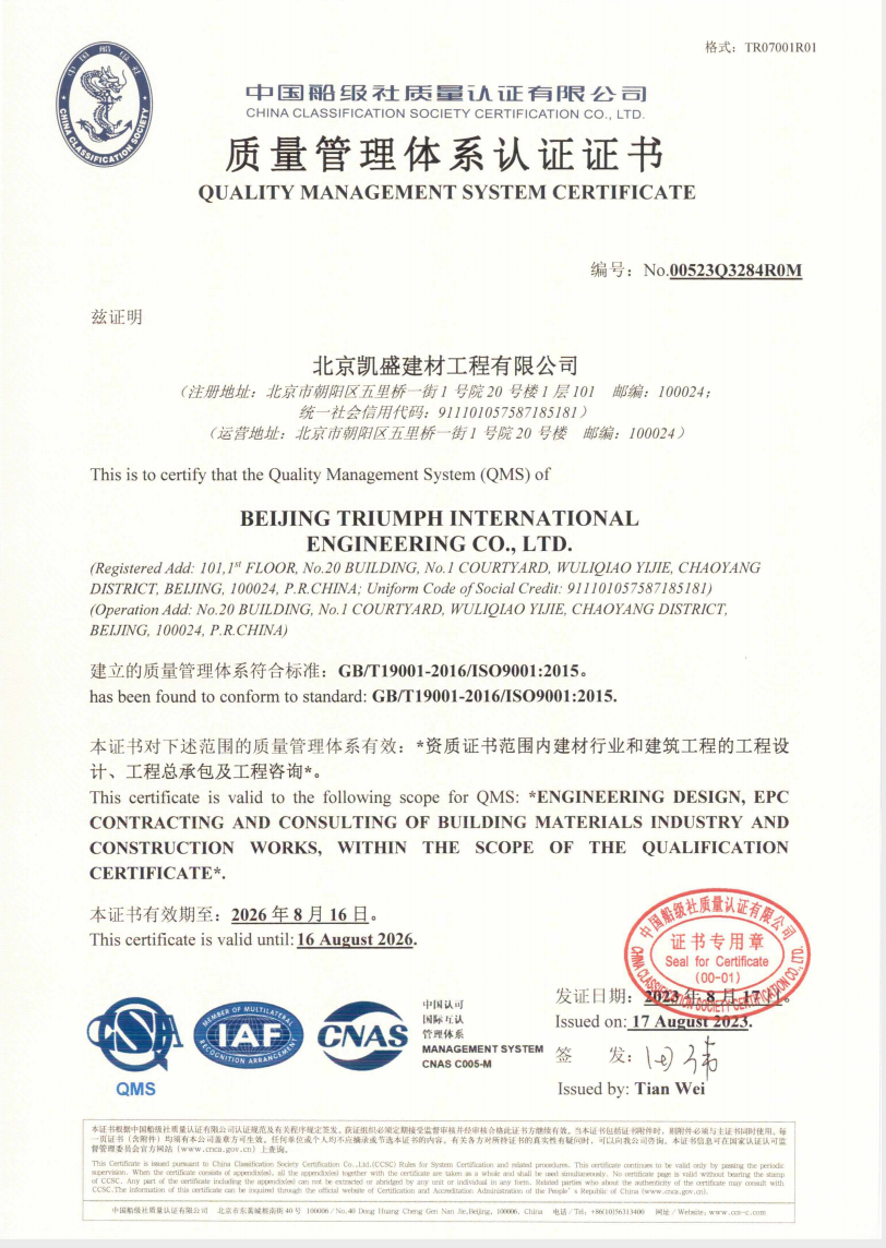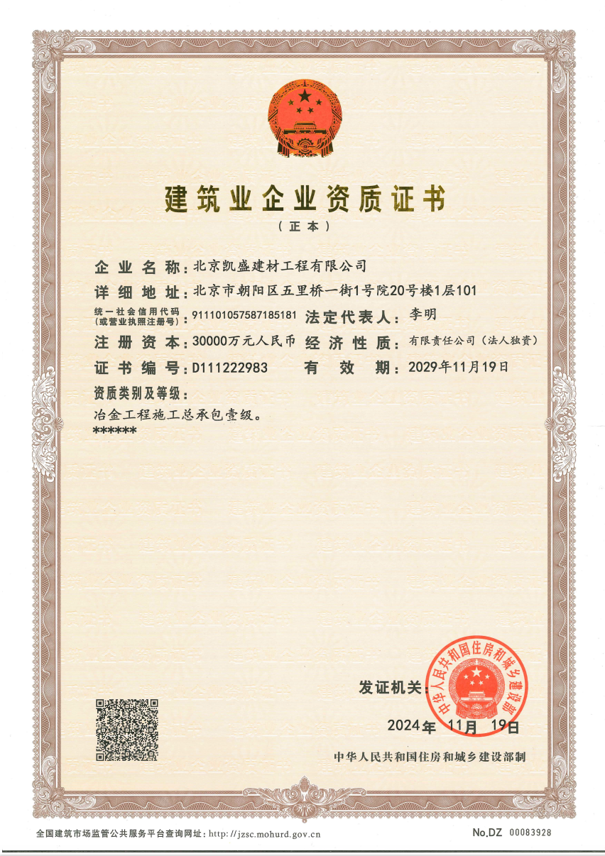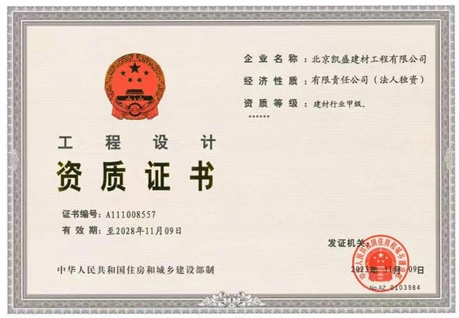 北京凱盛擁有國(guó)家建材行業(yè)工程咨詢(xún)甲級(jí)資信證書(shū)、建材行業(yè)甲級(jí)工程設(shè)計(jì)資質(zhì)證書(shū)、冶金工程施工總承包一級(jí)資質(zhì)證書(shū),是國(guó)家級(jí)高新技術(shù)企業(yè)。